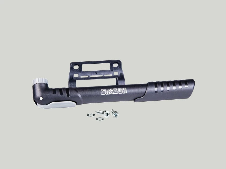 La pompe Ă main Simson Basic est une mini-pompe Ă vĂ©lo pratique et compacte au design moderne. La pompe s’adapte sur n’importe quelle valve. La plage de pompage est de 4 bar / 58 PSI. Vous pouvez fixer la pompe au cadre de votre vĂ©lo avec le support de cadre inclus Ă l’aide d’une clĂ© allen (non fournie).